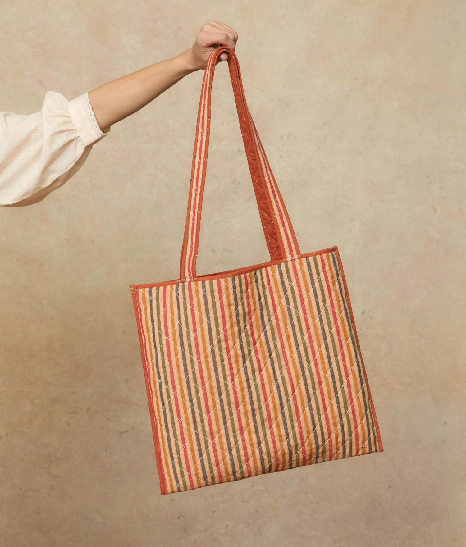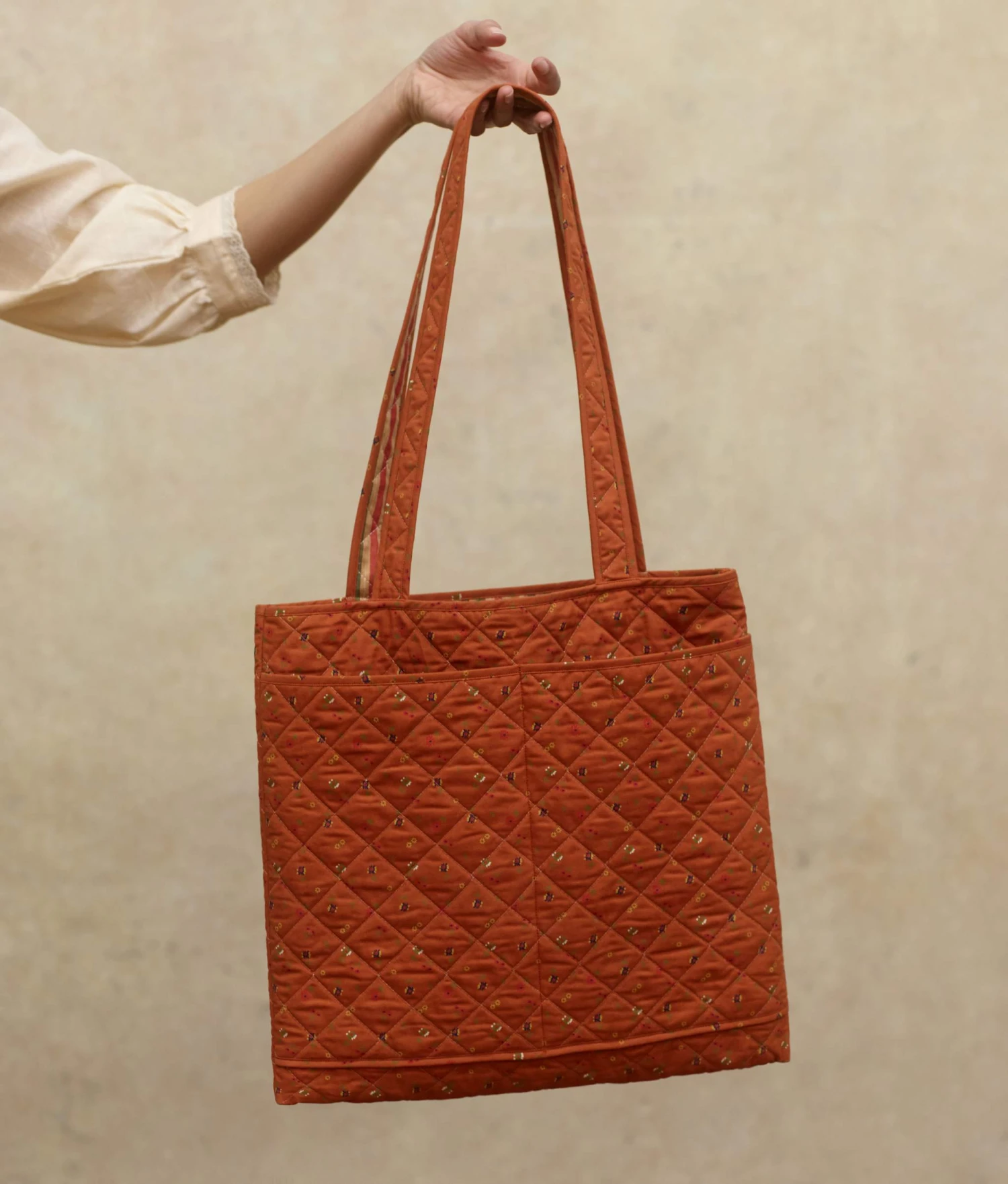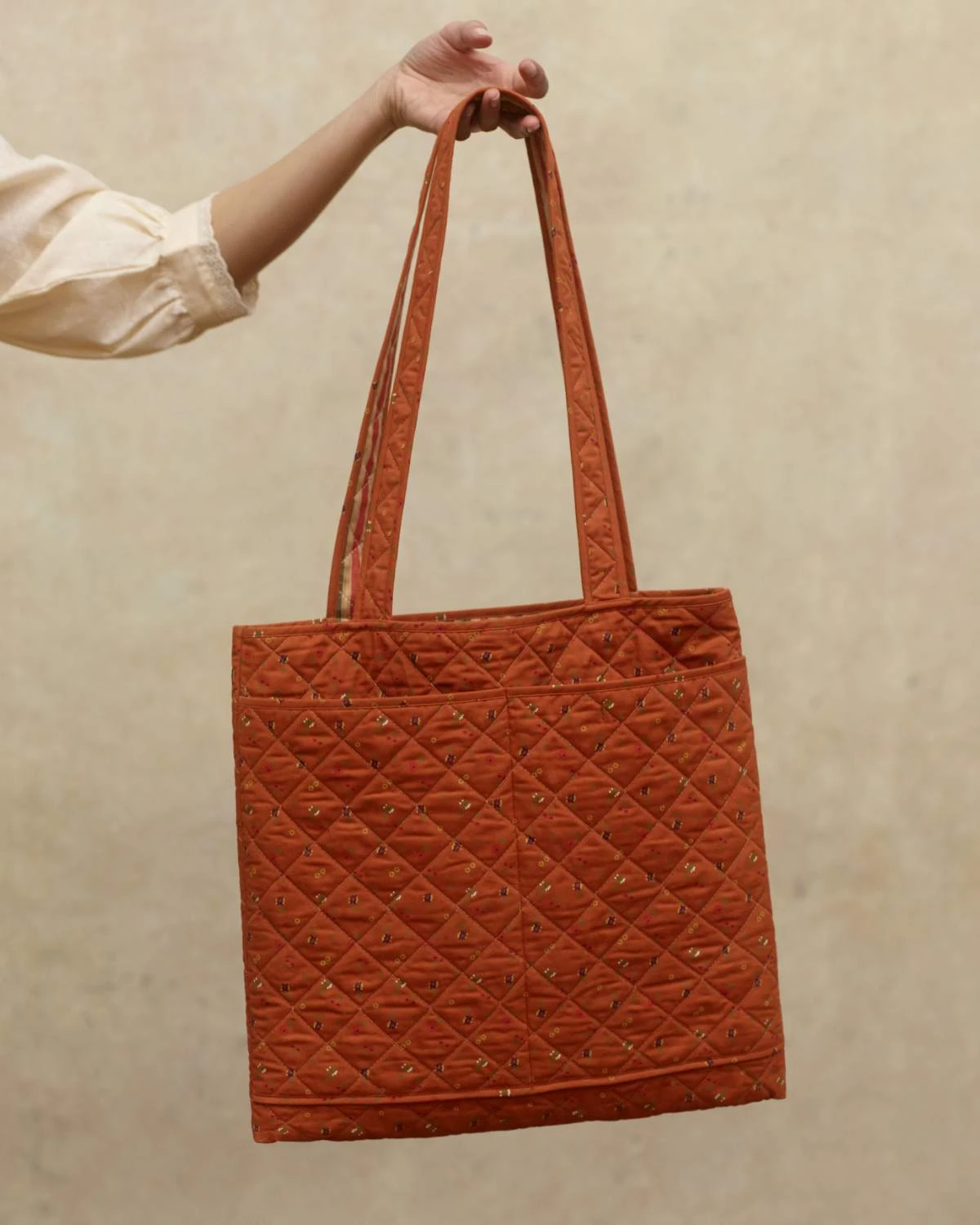 - Reusable and reversible quilted cotton tote bag