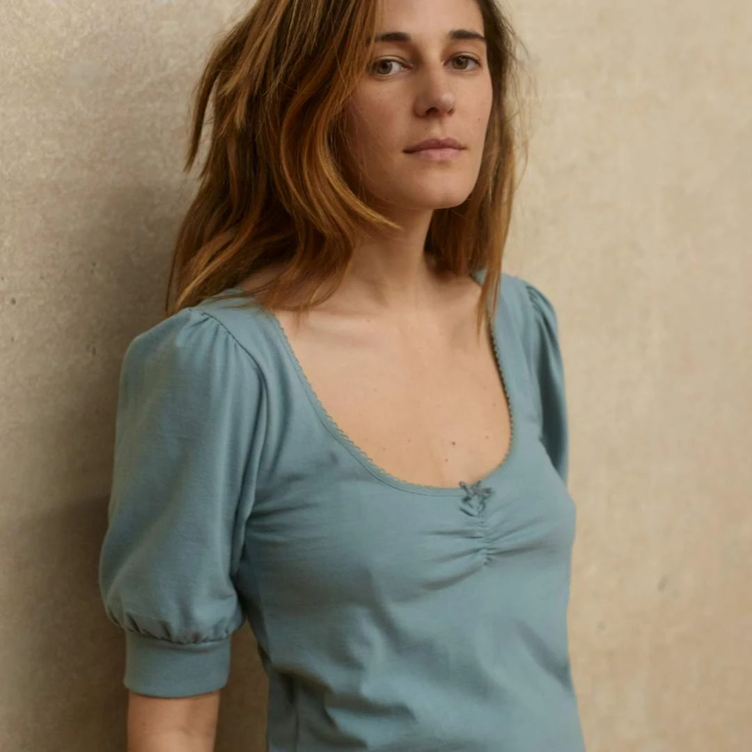 - Full elbow sleeve with gathers and rib cuff