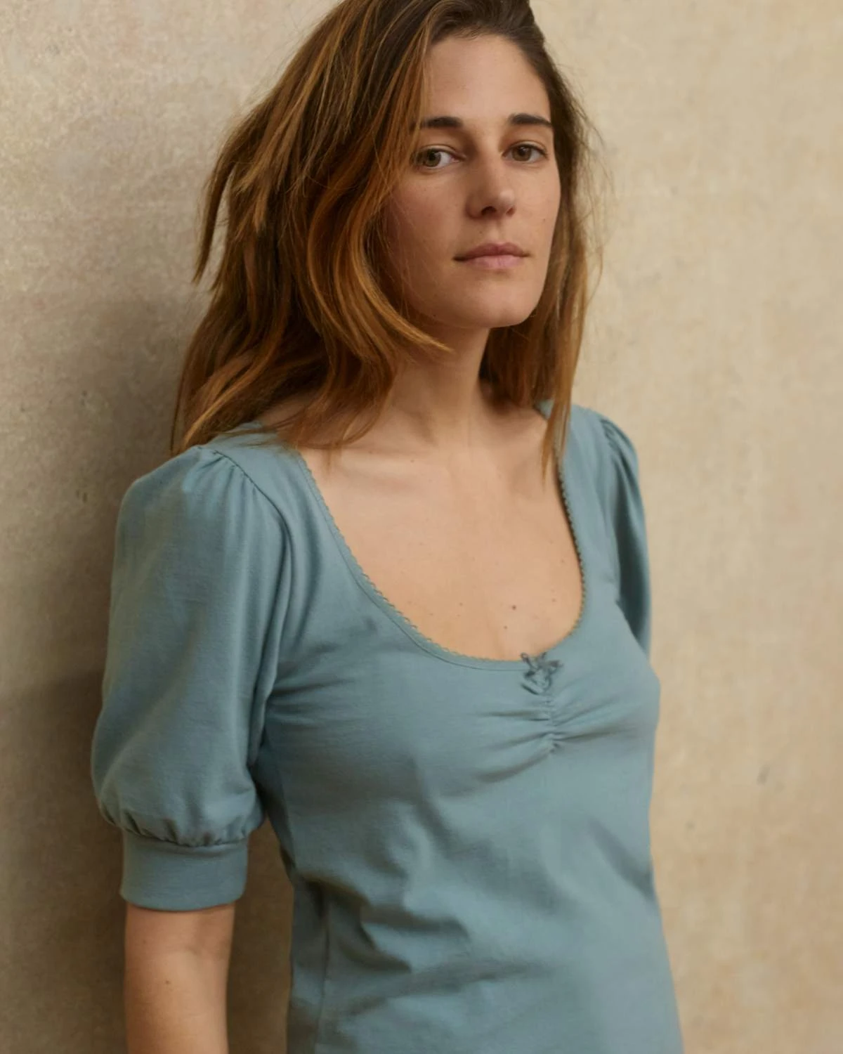 - Short gathers at front neck with mini bow