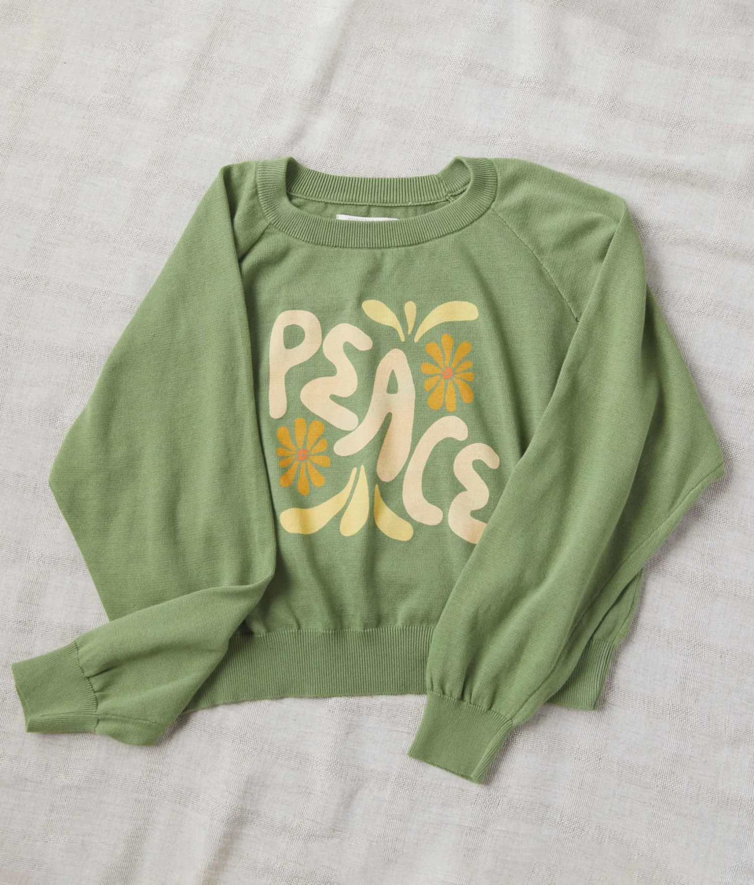 - Original Peace graphic on the front of the sweater designed by artist Catie St. Jacques of Sun Keep